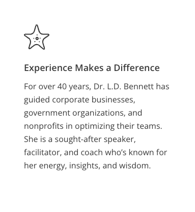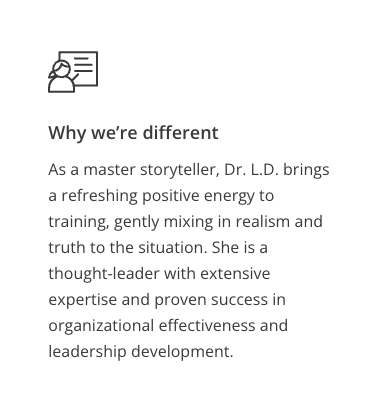“LD is a phenomenal Executive Coach. She connects authentically. Her no-nonsense approach along with her extensive experience and education resonate powerfully. She has immediate credibility that strengthens her unique ability to influence and impact regardless of the individual. She always exceeds expectations and sets a high-bar for executive coaching.”